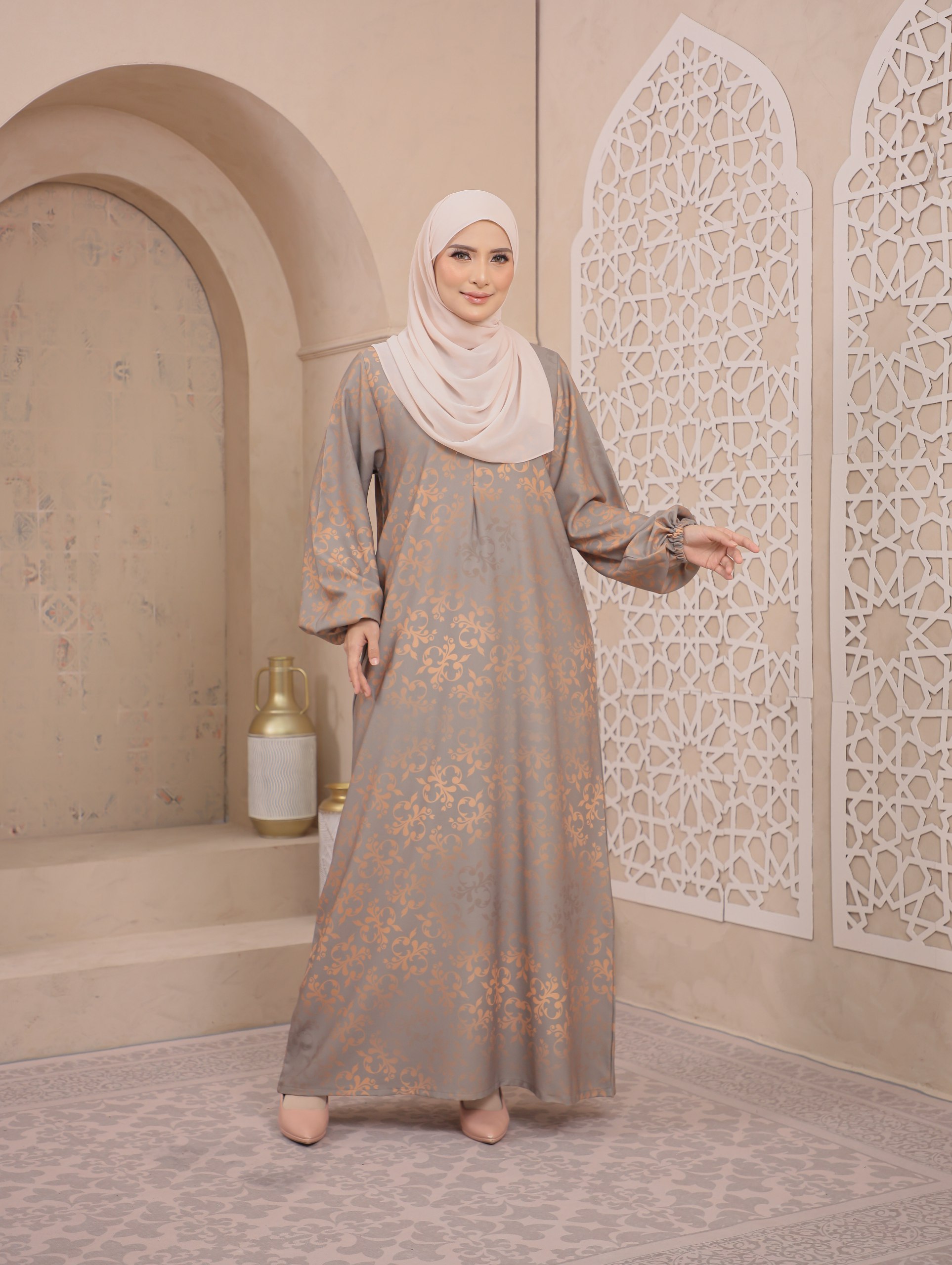 The abaya features a muted taupe-grey base overlaid with a bronze metallic floral damask pattern. The bronze sheen catches the light subtly, creating a soft luminous effect without looking overly shiny. The overall palette is warm, earthy, and luxurious, giving a refined neutral tone that is easy to style for both day and evening wear.
