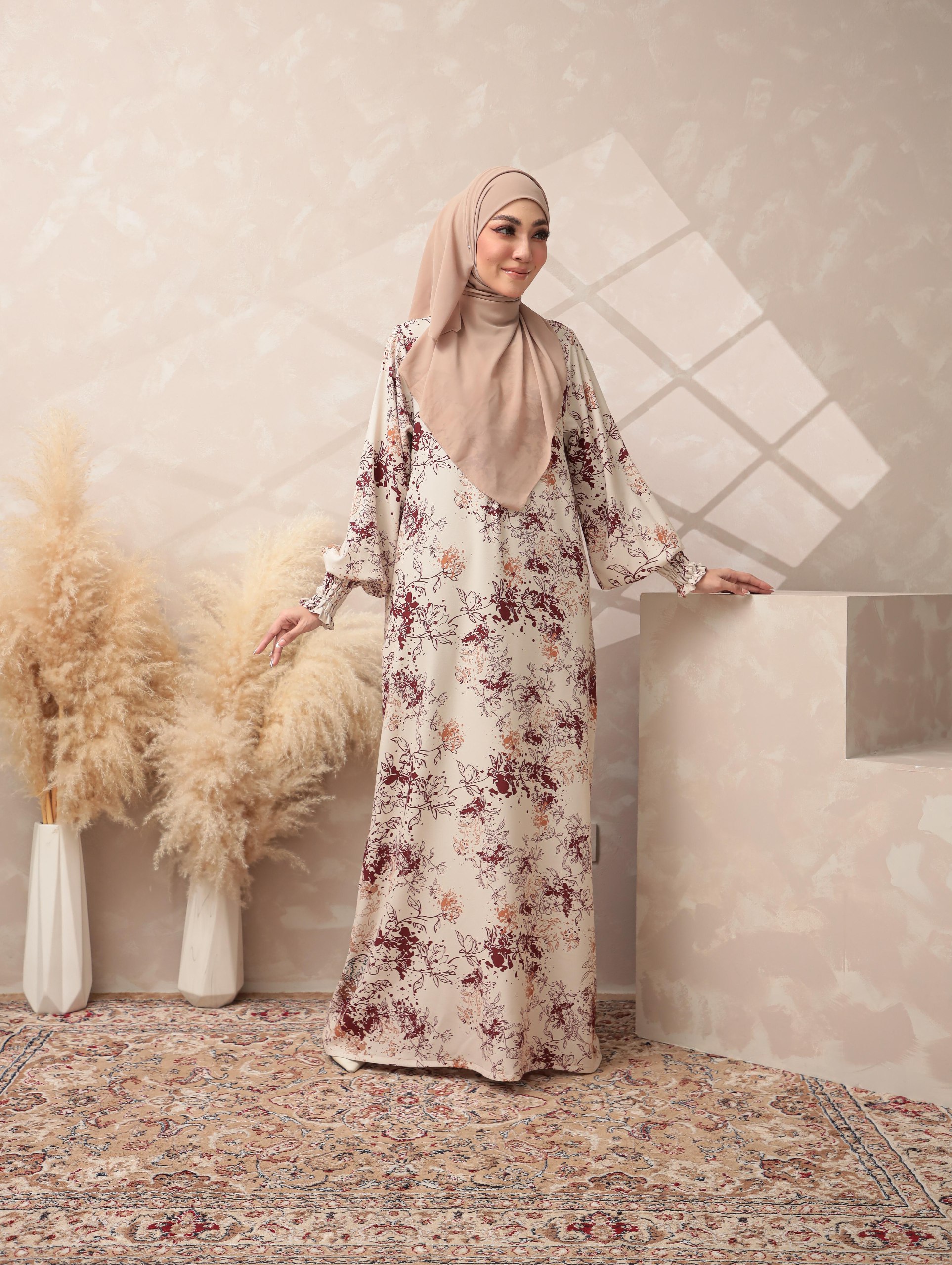 MALVA MEROON BEIGE A warm beige base accented with maroon and earthy brown floral splashes. The abstract botanical print gives a contemporary artistic feel while maintaining a soft, feminine charm.