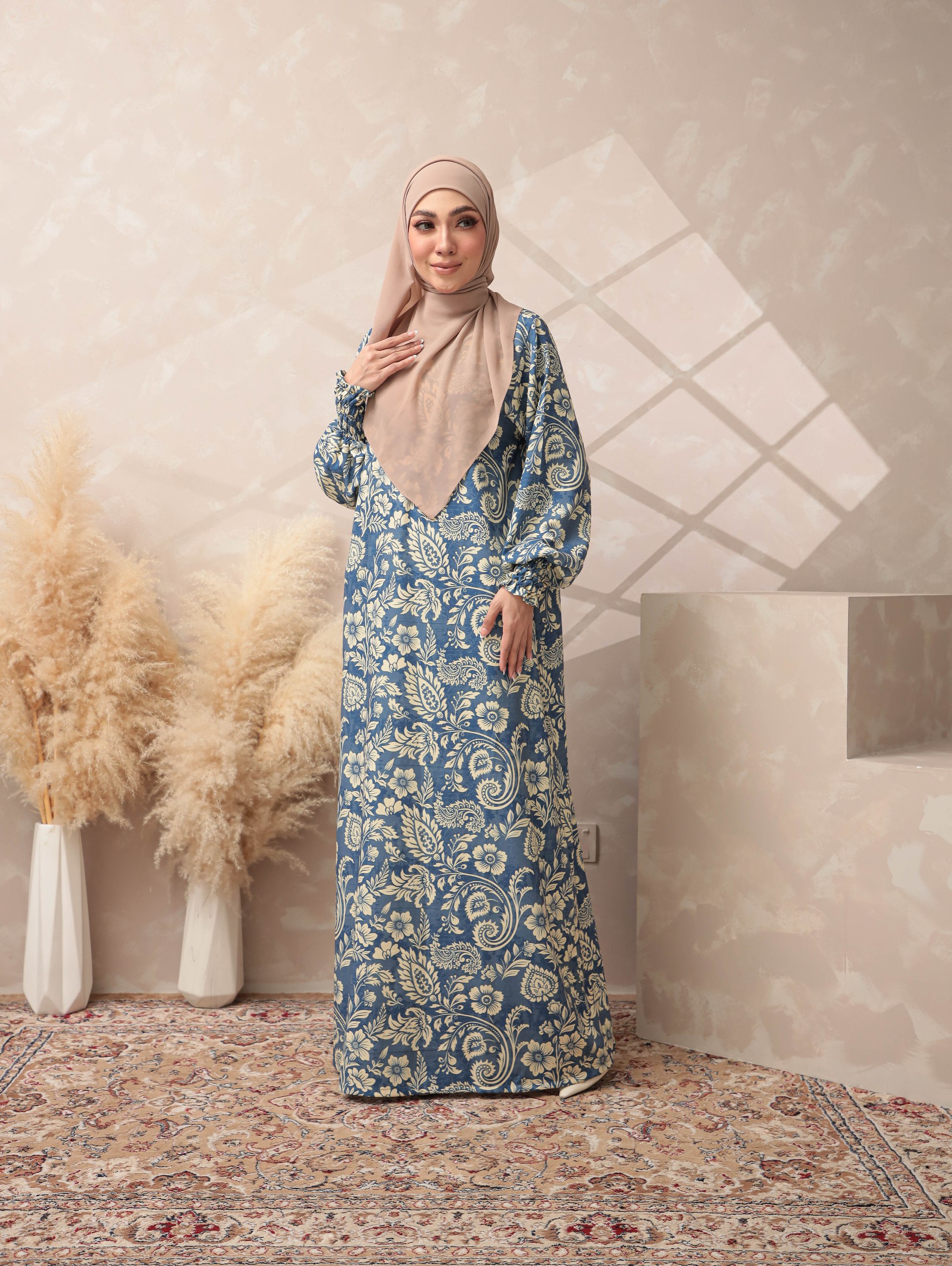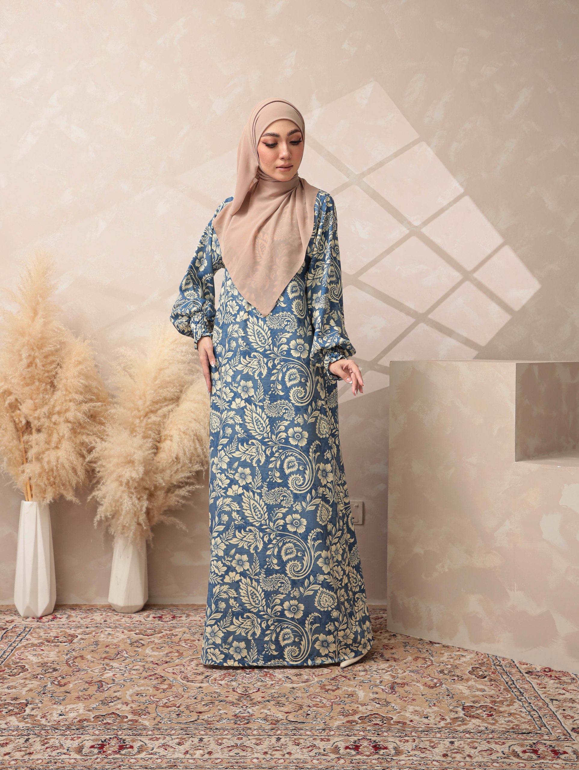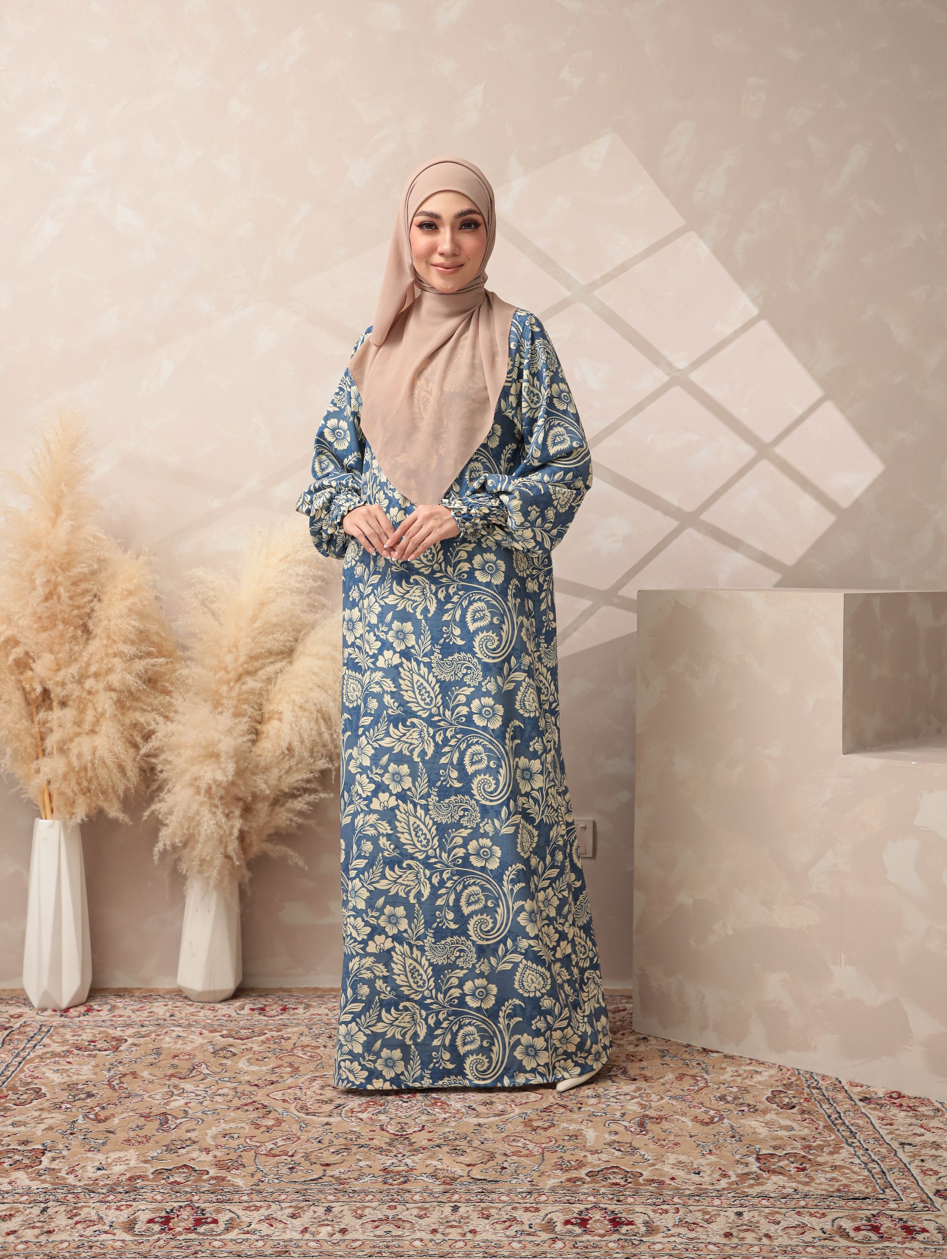 ELMINA BLUE A dusty blue base highlighted with intricate cream botanical motifs inspired by classic European floral patterns. The tone is soft, elegant, and soothing, suitable for a refined Raya style.