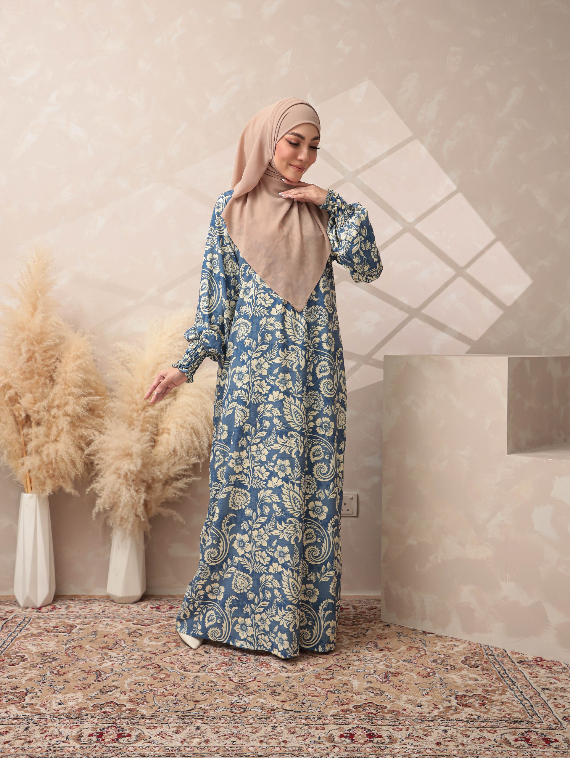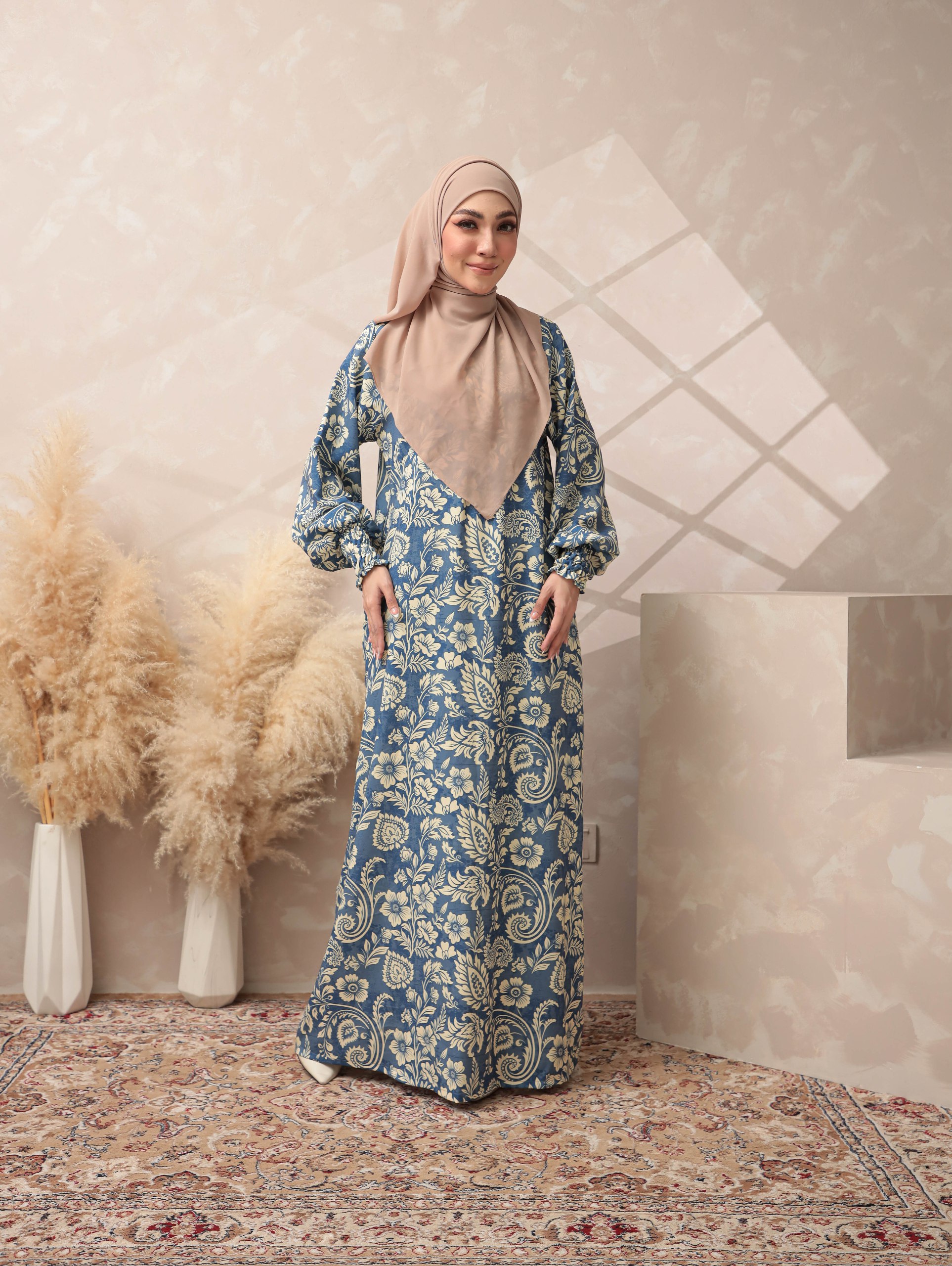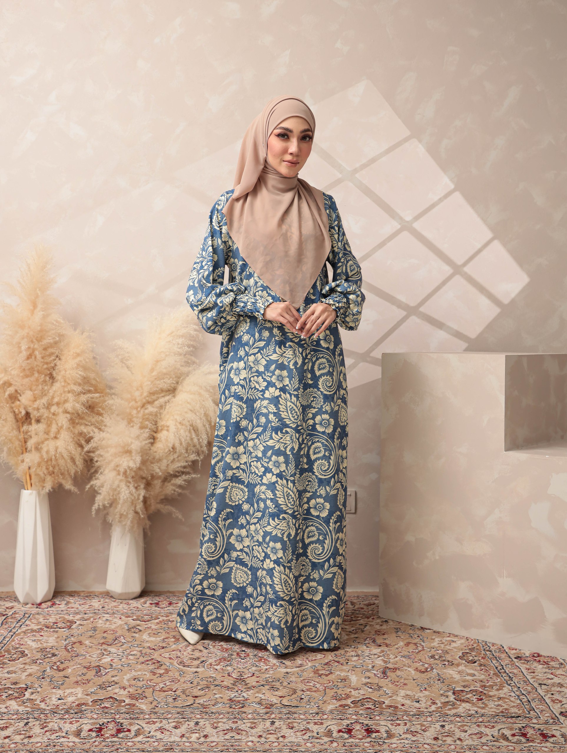 ELMINA BLUE A dusty blue base highlighted with intricate cream botanical motifs inspired by classic European floral patterns. The tone is soft, elegant, and soothing, suitable for a refined Raya style.