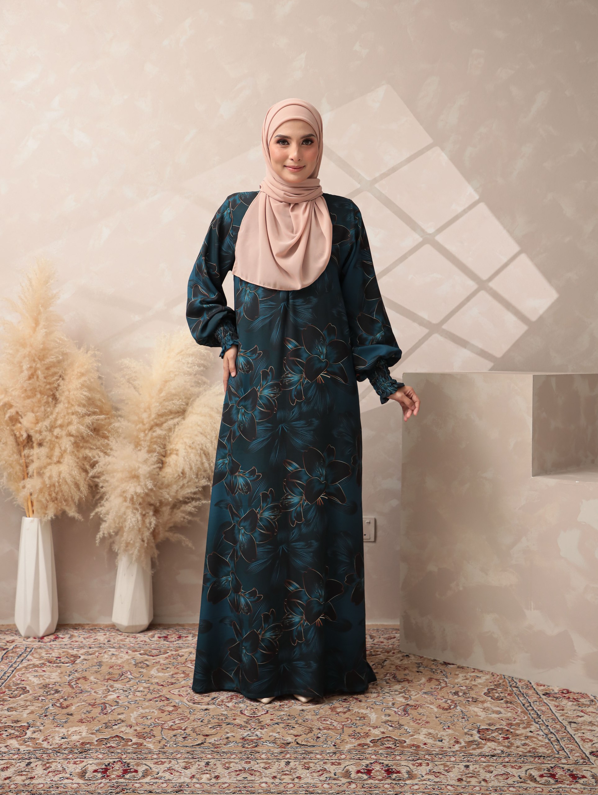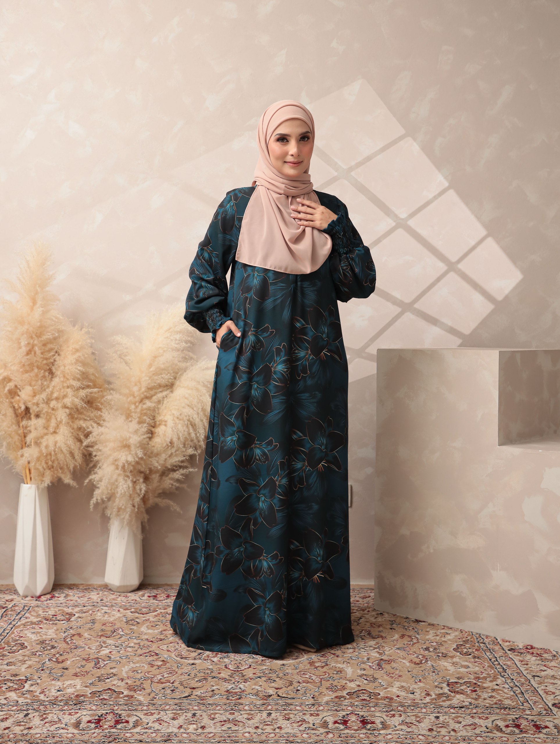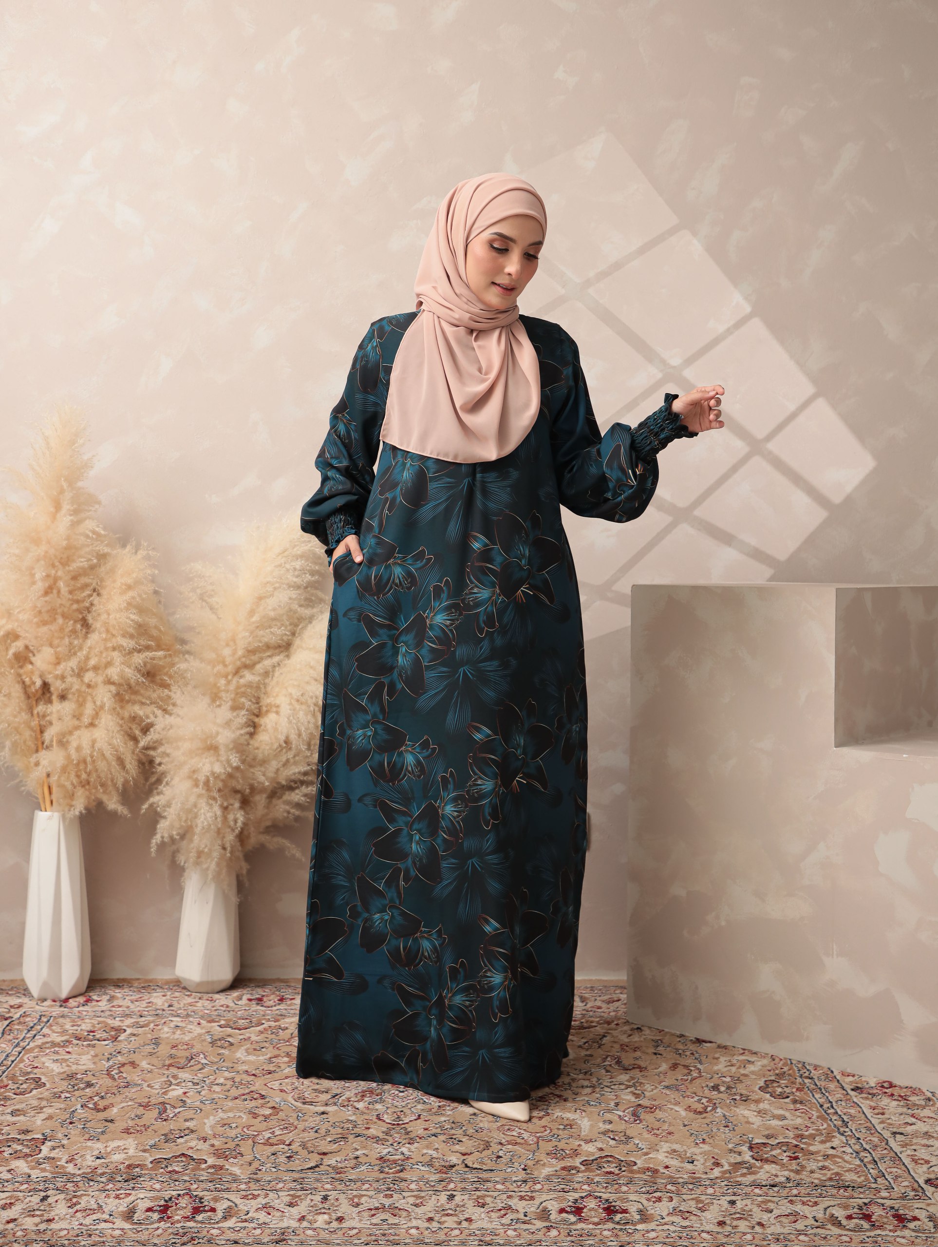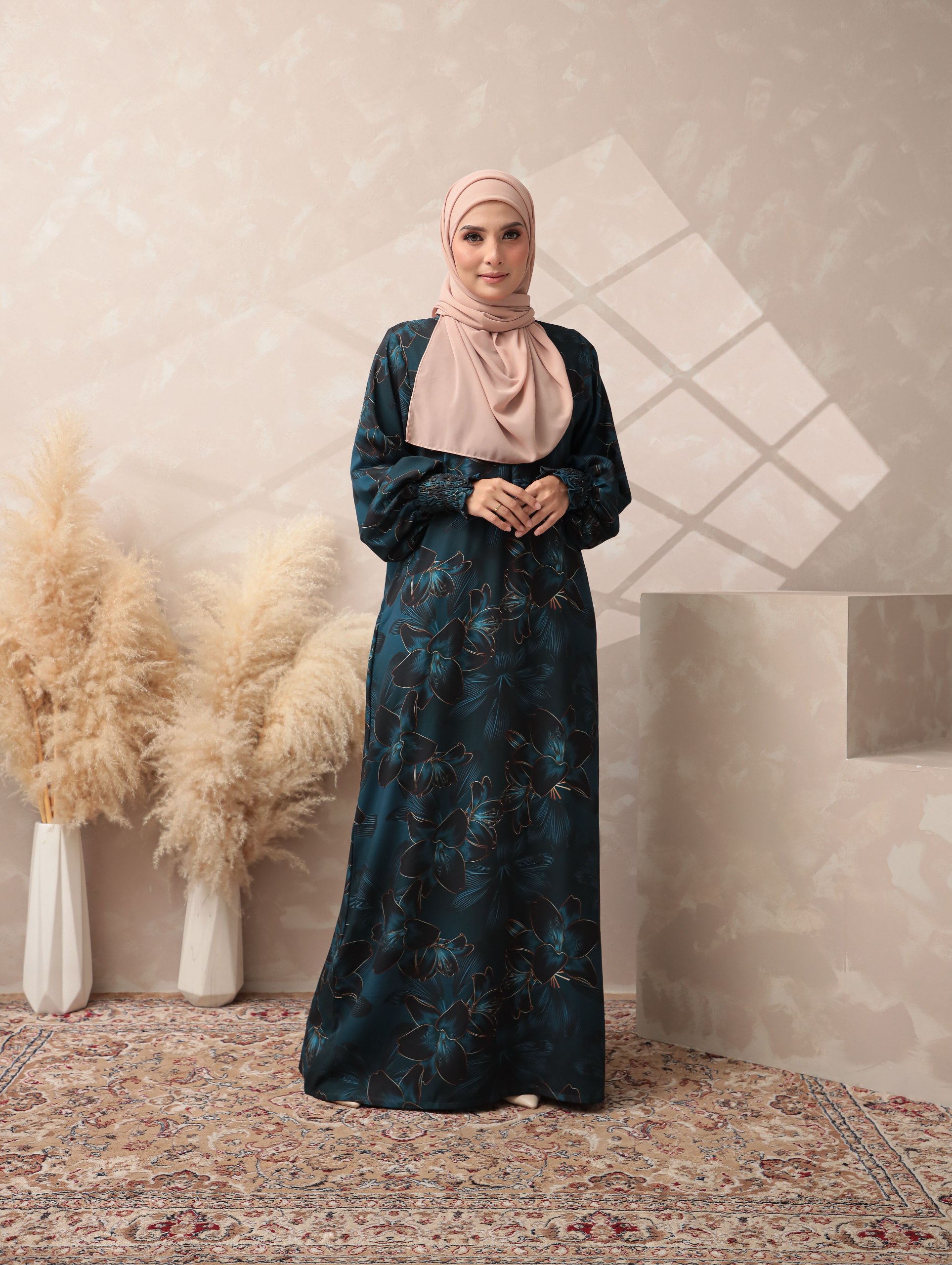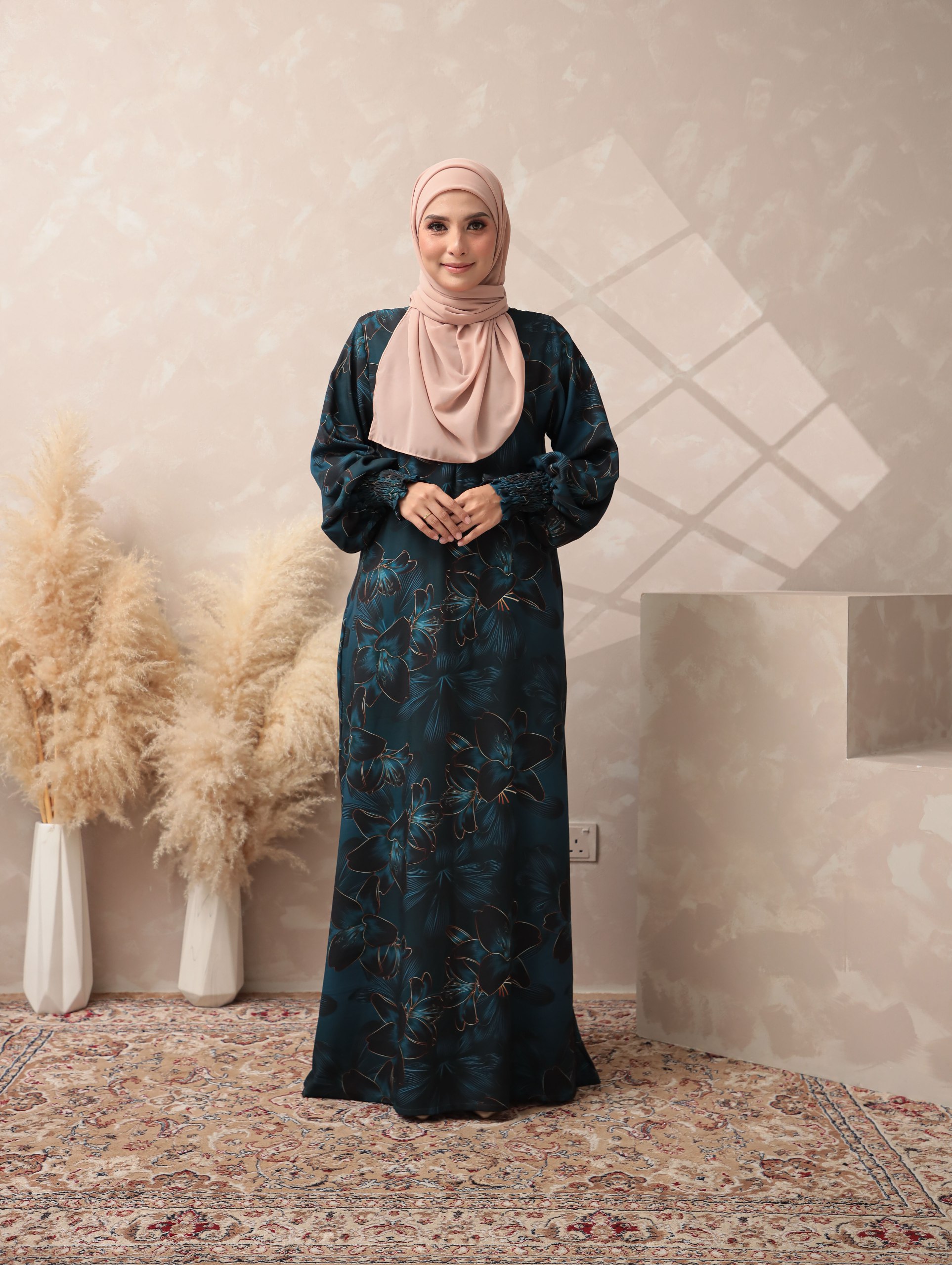 THALIA EMERALD GREEN features a rich deep emerald green base with a subtle teal undertone, creating a luxurious and refined look. The darker floral motifs add soft contrast, giving the fabric a graceful dimensional effect while maintaining a modest and elegant appearance