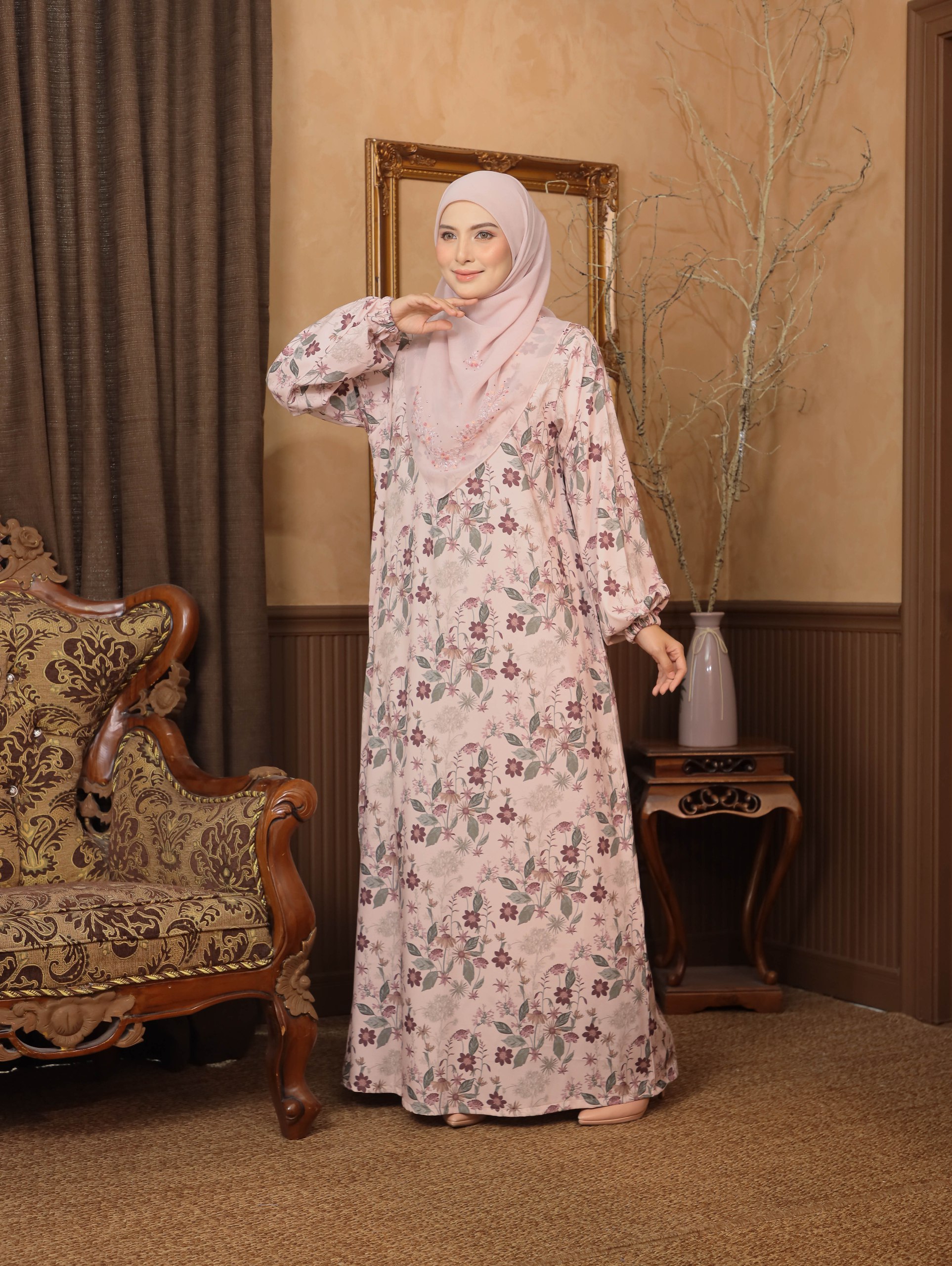A soft dusty blush pink base adorned with delicate vintage floral motifs in muted rose, sage green and soft mauve tones. The scattered botanical pattern creates a gentle garden-inspired aesthetic, giving the jubah a graceful, feminine and timeless charm.