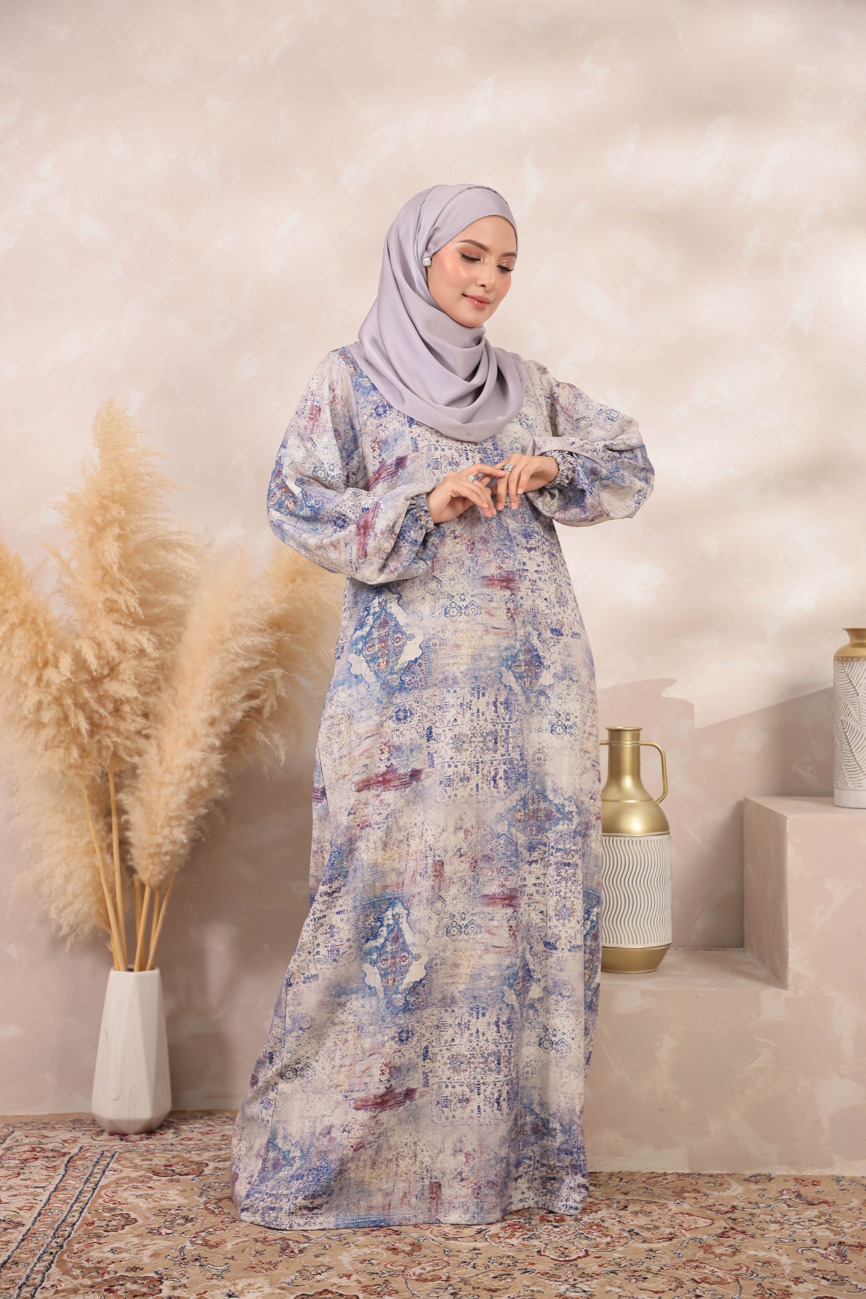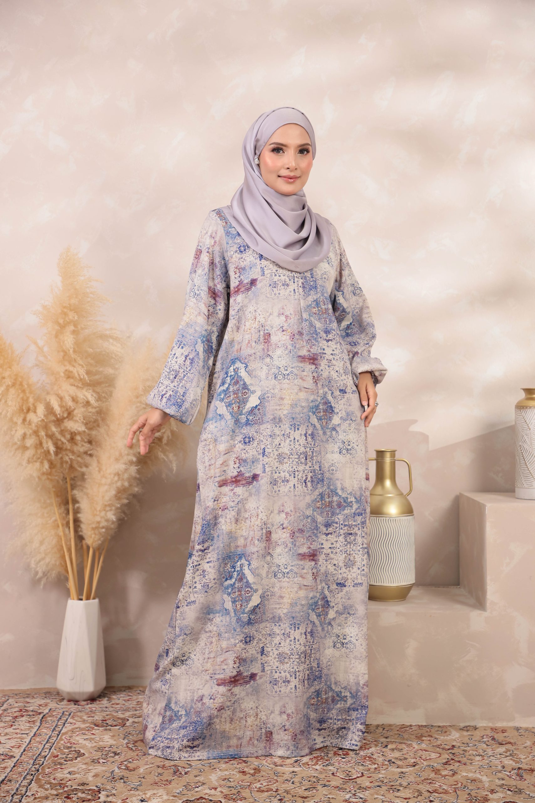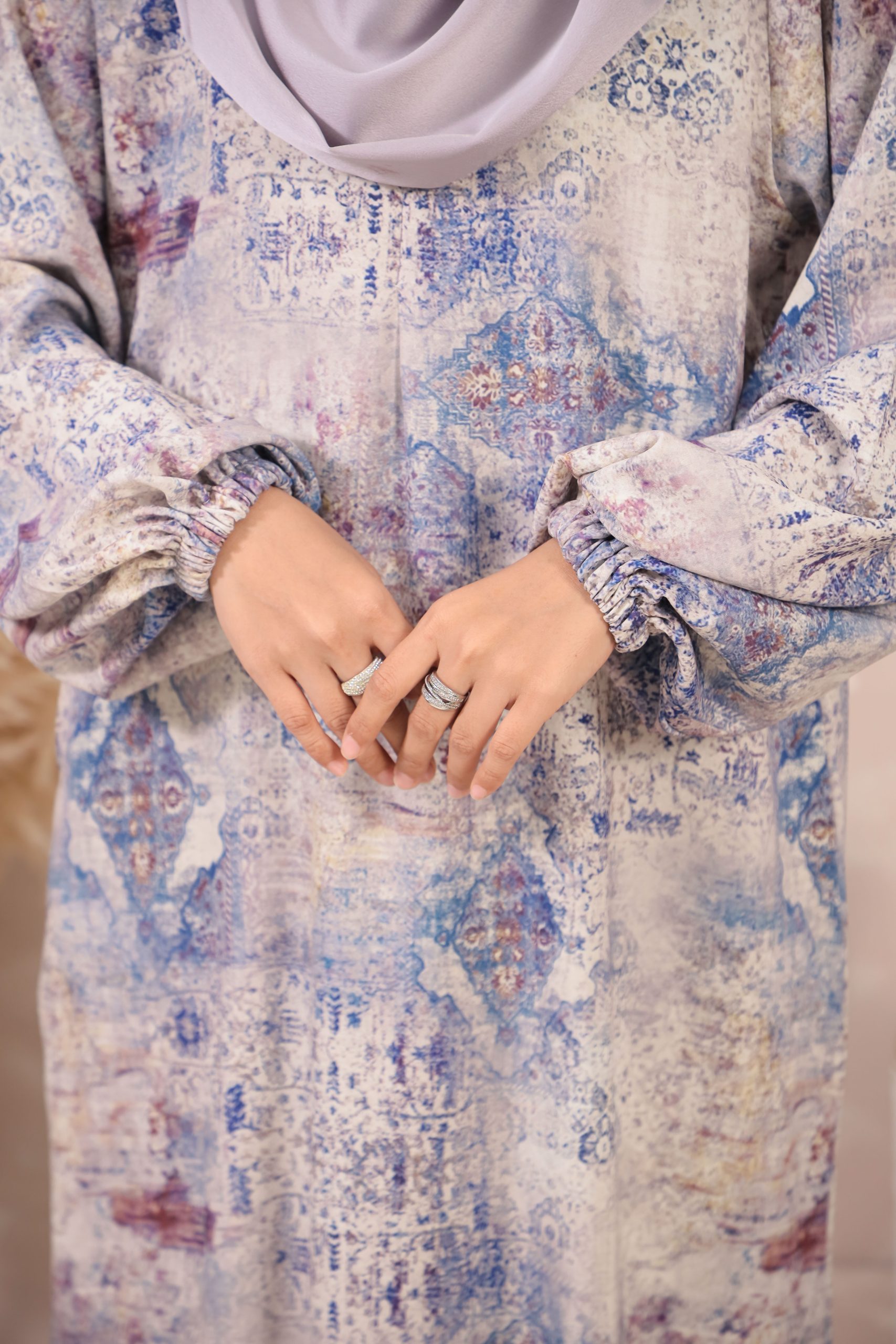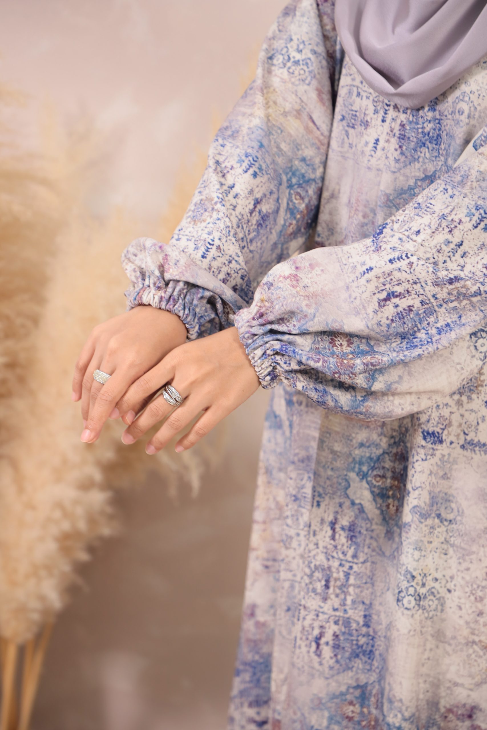 Iressa Arté embodies an artistic, vintage-inspired elegance with a soft contemporary touch. Designed on a muted ivory-beige base, the fabric features an abstract heritage mosaic print in shades of dusty blue, faded indigo, soft plum, and antique taupe, creating a refined painterly effect.